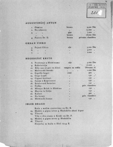 HEGEDUŠIĆ KRSTO, pittore - Zagabria, via Markova 3
